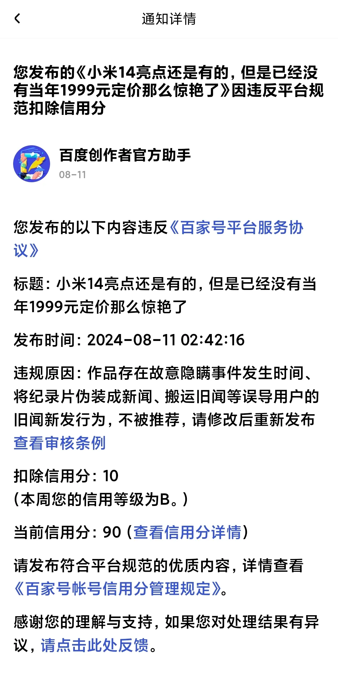 我查看发现原来百度把我之前的内容同步过来之后,就以我发布旧闻冒充新闻为由扣分,百家号真的无耻啊。