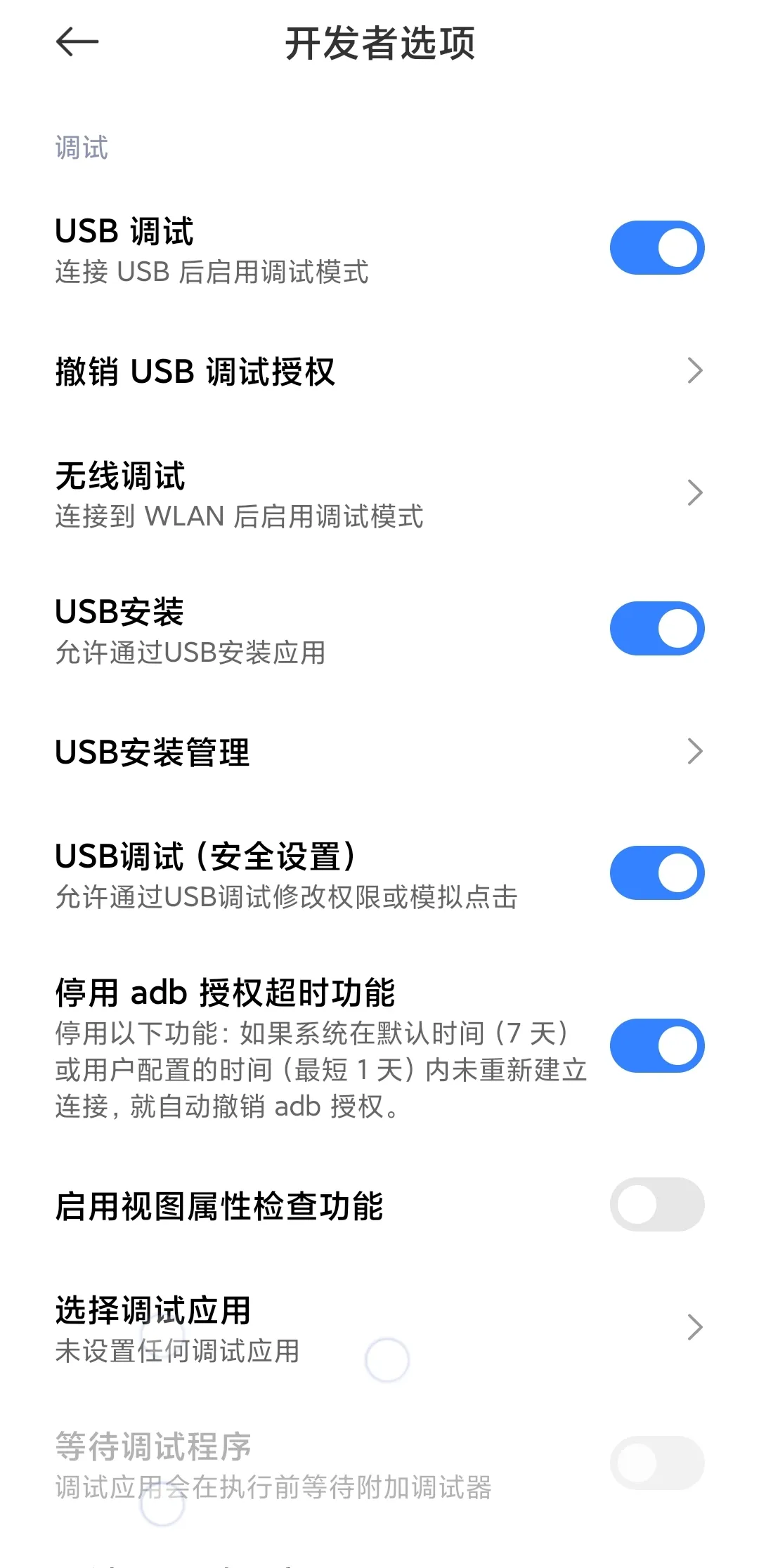 开启开发者选项后把USB调试、USB安装应用、USB调试、“仅充电”模式下允许ADB调试功能都打开。