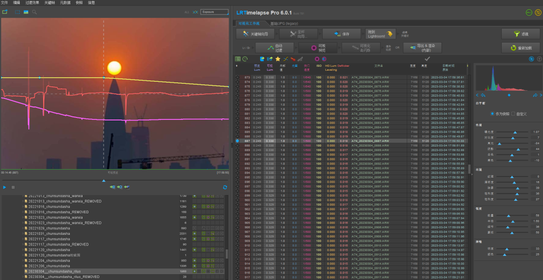 3、用LRTimelapse软件处理延时,先给重要的几张图片加关键帧,然后用Lightroom Classic对加关键帧的图片调色,调色完毕后用LRTimelapse自动处理延时视频,使视频亮度能平滑过度,降低画面闪烁