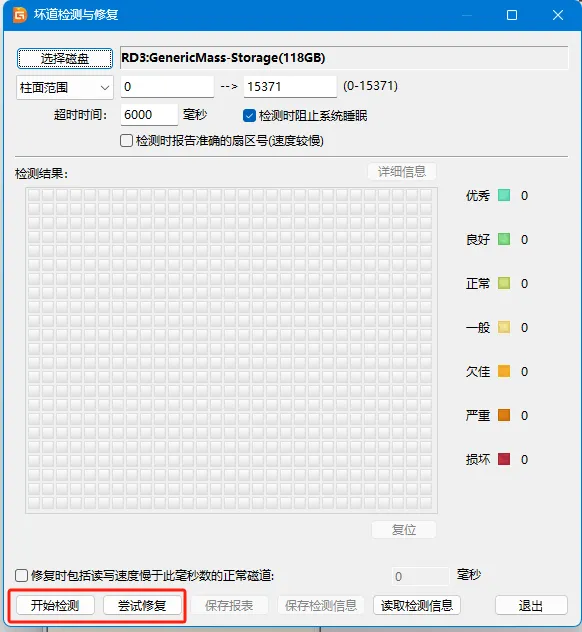 先检测一下是否有坏道,当然也可以直接点尝试修复,检测到有坏道直接帮你修复