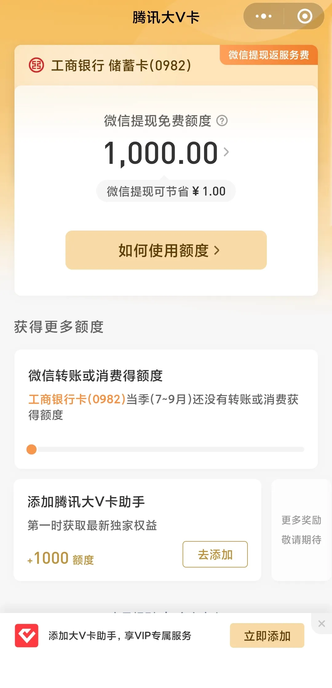 首次开通腾讯大V卡就获得初始额度,使用绑定腾讯大V的银行卡微信转账或消费可以按支付金额1:1增加额度,最高增加额度是按季度统计的,当前季度通过支付可获得最高3000元额度。
